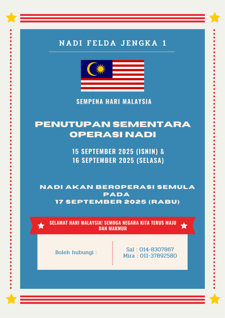 Dimaklumkan kepada semua ahli dan pengguna, NADI Felda Jengka 1 akan ditutup sementara pada 15 dan 16 September 2025 (Isnin & Selasa) bersempena dengan sambutan Hari Malaysia.